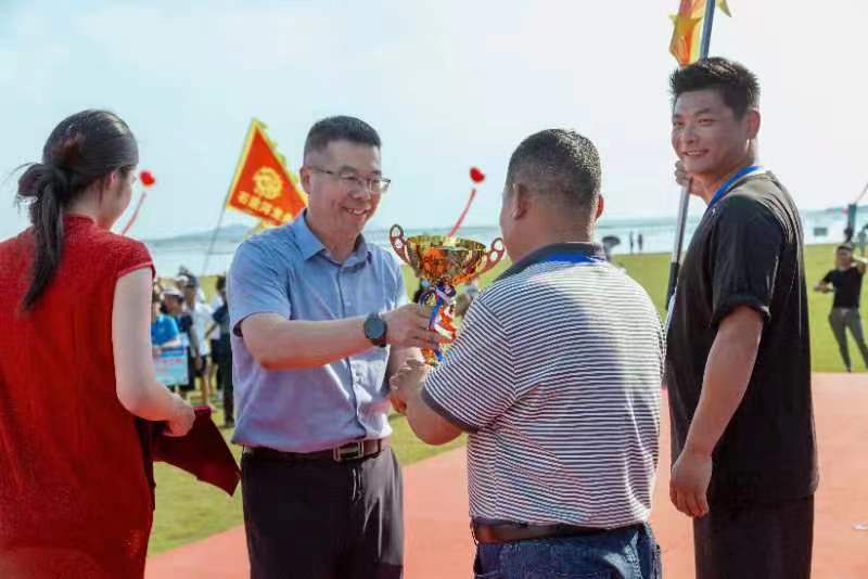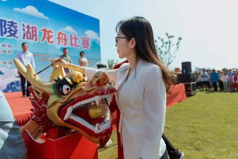 明陞M88平台副董事长金芙蓉和市交通控股集团有限公司董事长仲伟涛共同为龙舟点睛,副市长宋波宣布开赛。